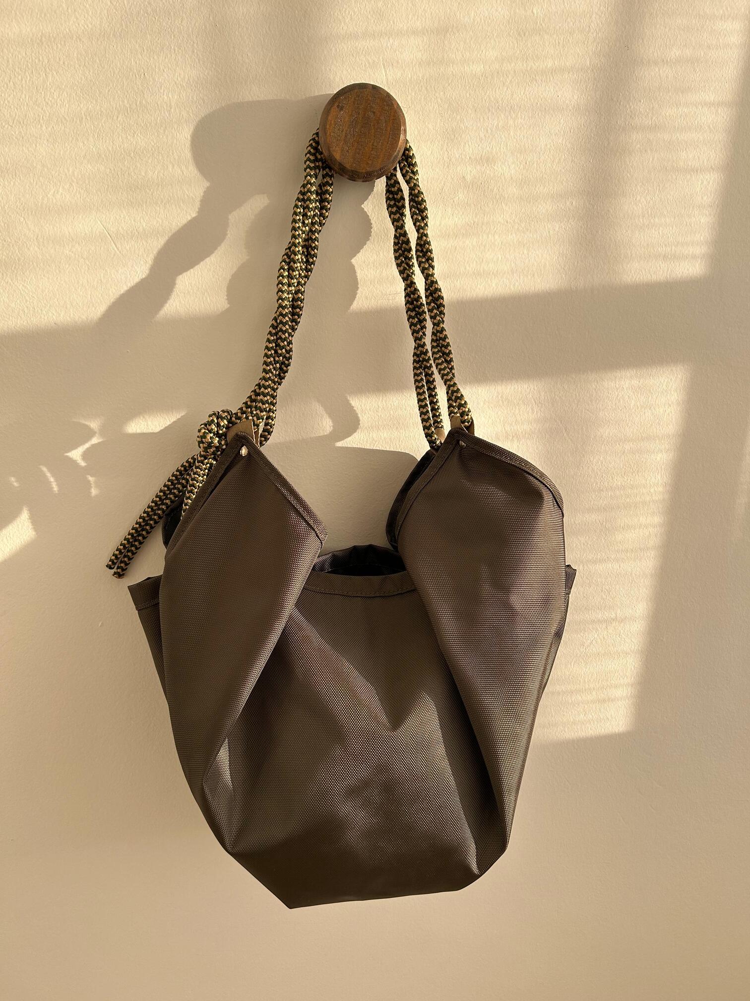 Bolsa “saco” em poliéster, super funcional e resistente. Não desbota. Modelagem origami quadrada. Alças de ombro em corda náutica trançada. Dois bolsos internos de 17 x 17cm fixos em viés.