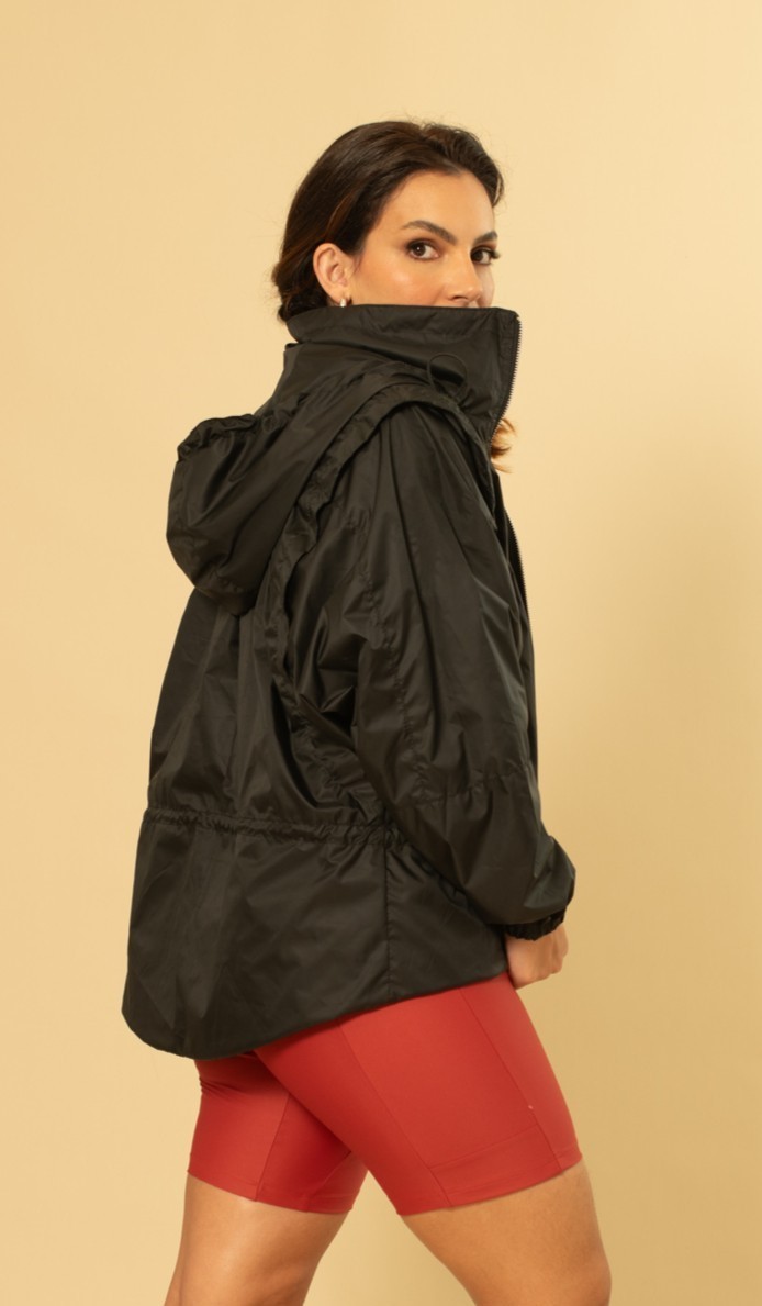 Jaqueta corta vento em nylon. Gola alta com abertura posterior para guardar capuz. Elásticos roliços em capuz e cintura com ajuste de transparente. Zíper metálico centro frente. Bolsos embutidos em costura lateral frente. Forro duplo em tela leve.