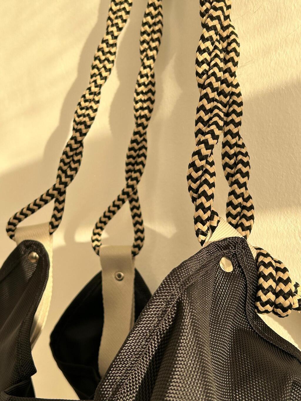 Bolsa "saco" em poliéster, super funcional e resistente. Não desbota. Modelagem origami quadrada. Alças de ombro em corda náutica trançada. Dois bolsos internos de 17 x 17cm fixos em viés.